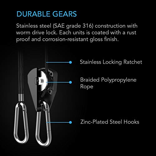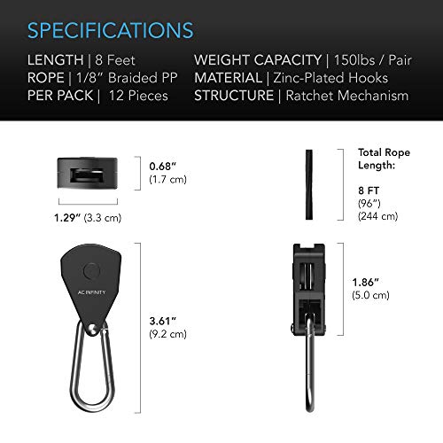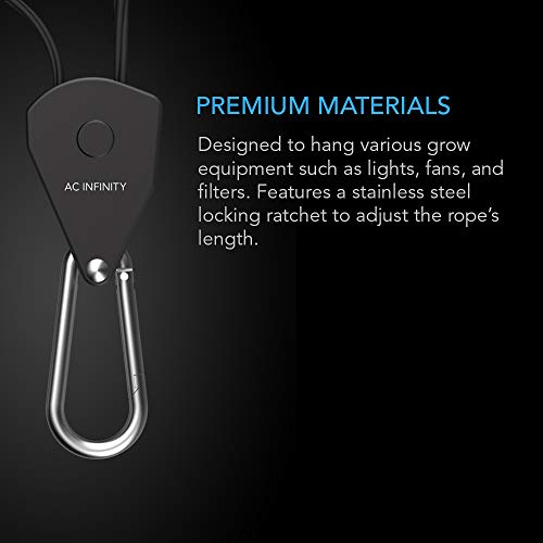 Details: Product DescriptionThe rope hanger is designed to hang various grow tent and ventilation equipment. You can easily push the carbineer hook to clip and secure your equipment. Then pull on the rope, which will automatically lock with the stainless steel ratchet mechanism. The rope is made of 1/8” braided polypropylene, and the hooks are constructed of zinc-plated steel. The internal gears inside the locking ratchet are all built with stainless steel parts for a long-lasting smooth operation.ApplicationsUsed for hanging various growing and ventilation equipment, including inline fans, carbon filters, reflectors, grow lights, and flower pots.