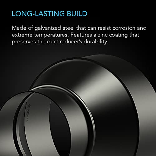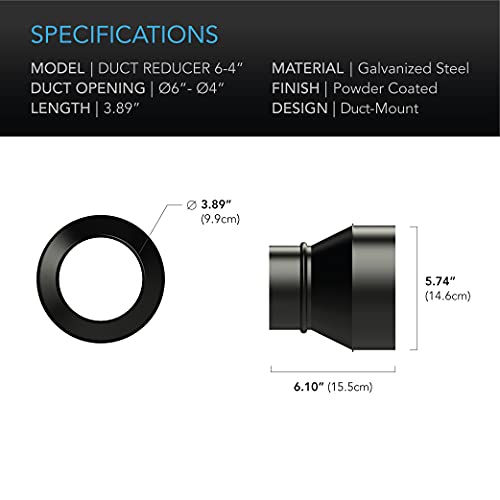 Details: A ducting cone designed for adapting ductwork to equipment like bathroom fans and dust collectors. Maintains airflow efficiency by creating a seamless connection between two different sized duct openings. Raised lips on the smaller opening for extra grip on ducting or your equipment’s duct opening. Galvanized steel body that is corrosion-resistant and can withstand high temperatures. Adapts 6 inches to 4 inches | Product Length: 5.11 inches | Finish: Zinc Coating Product Description A ventilation ducting tool designed to fit different-sized duct hole openings together, connecting smaller ducting to bigger fans and vice versa. Using this duct adapter to connect your ventilation fans to your ducting will help retain your system’s CFM efficiency. It features a raised lip on the reducer end to provide extra grip on ducting or duct openings, while the increaser end features a flat brim to achieve a flush fit. The galvanized steel body is finished with a zinc coating that aids in its resistance to corrosion and high temperatures. Applications The duct adapter is a versatile tool that can be retrofitted with a variety of different-sized ducting and fans. It is commonly paired with bathroom exhaust fans and dust collection units to adapt them to smaller ductwork as a reducer. Other adaptation projects include range hoods, tumble dryers, grow tent ventilation systems, and connecting smaller ducts to bigger ducts. Product Identification Manufacturer AC Infinity Inc. Product Name Duct Reducer 6" to 4" Adapter Product Model AC-SDR64 UPC Code 819137021334 Product and Mounting Dimensions Duct Opening Sizes 6" to 4" Product Length 5.11 in. (13.0 cm) Product Performance and Technical Specs Construction Galvanized Steel Color Metallic Silver Finish Zinc Coating