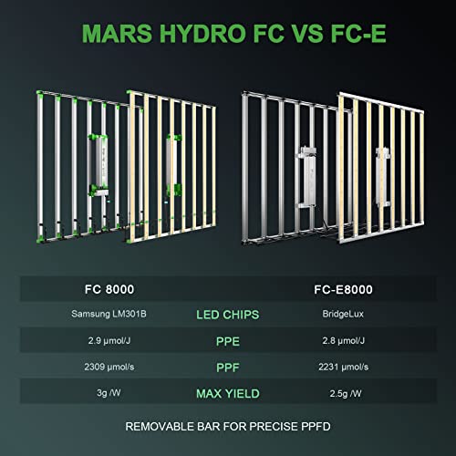 - MAXIMIZE YIELDS & CROP QUALITY: MARS HYDRO FC8000 LED growing light with 2968pcs Samsung LM301B & Osram 660nm Diodes, boast the market-leading efficiency 2.9 µmol/J, Max 3.0g yield per wattage with 30% higher Average PPFD,achieve 50% higher yield & quality compared with the old lights! Only consumes 800w perfect light for 4x4ft flowering.