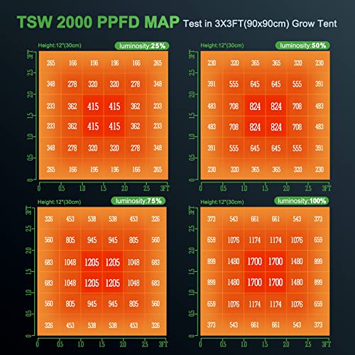 • 2023 UPGRADED HIGHLY-REFLECTIVE HOOD LED LIGHT: The upgraded white reflector design on TSW2000 grow light is patented, With a refraction angle of 120°, it can cover a wider reflector range to enhance its light intensity as well as assist plants in absorbing more light. The actual power of TSW2000 is 300 watts, while other brand model 2000 is only 200 watts.