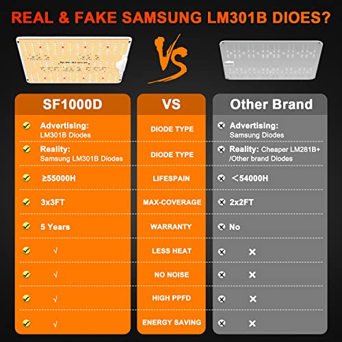 - UPDATE DIODE and BETTER LIGHT PENETRATION: SF1000D changed from SAMSUNG 301D Diodes to More Expensive 301B Diodes-the highest light output LED available at present, delivers powerful light output and uniform canopy penetration to resulting maximum higher yields compared with other LED grow lights.