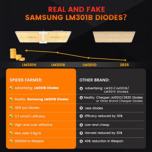 - LOWER RUNNING COSTS & HIGHER-QUALITY YIELDS: SPIDER FARMER LED Grow Lights utilize the latest in high yielding LEDs technology today-Samsung LM301B diodes, high Energy Efficiency with 2.7 umol/J, create the better canopy light penetration. Veg coverage 3 x 4 ft, Flower 2 x 4 ft. Extremely high output but consumes only 200W of electricity, making it more efficient than traditional HID lamps and other plant lamps on the market.